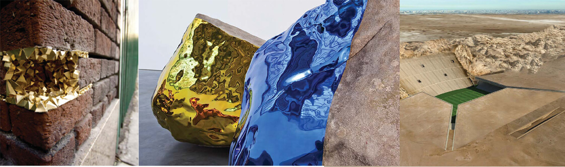 愈來愈多富於創意的人士及設計師們,正著手結合環境、科技及藝術等各種不同的領域,將它們的概念交疊運用匯集並呈現。因此,我們看見某些建築物的造景融入周圍環境中;一些屋宇的角落成為藝術表演的主題;也看到許多石塊披覆上繽紛的色彩。在街頭藝術的領域,我們發現了沾染濃厚東方氣息的礦石美學作品:遵循古老的日本摺紙藝術,美國藝術家Page Smith利用大量的金屬色小紙片,經過無數次摺疊後,創造出許許多多的微型雕塑嵌入洛杉磯的都會背景中,為原本平凡無奇的城市磚牆增添了一股奇幻的情調。在原始與精緻兩種相互對立的美感混融的概念激發下,Jim Hodges發揮想像,將巨大的石礫變身為雕塑作品,並以閃閃發亮的金屬色澤為它們半裹上彩衣。建築方面,也尋求能逐漸拉近人類與地球間距離的設計方案。在阿拉伯聯合大公國,艾恩足球俱樂部(Al Ain FC football club)的新球場呈現出充滿未來感的設計,便是揣想著建築結構體在沙漠當中受到完美的偽裝掩護。